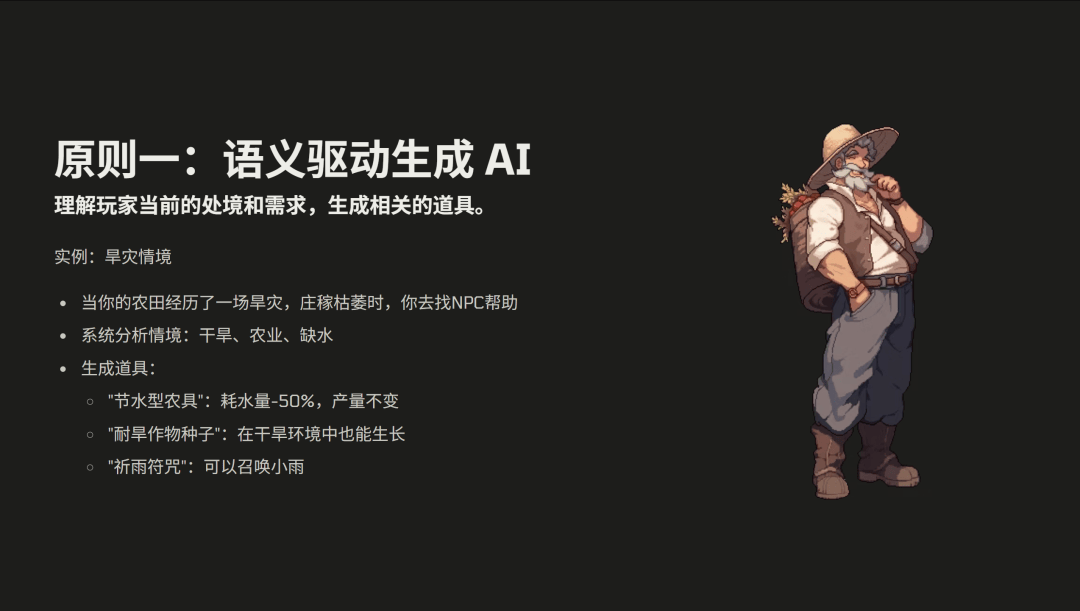 举个例子,在游戏当中可能会出现一个旱灾的剧情。农田经历了一场旱灾,庄稼枯萎的时候,系统可以识别到你可能需要一些帮助。它也会识别到当前的情境是旱灾,农业缺水,生成的道具可能就会是节水型的道具,给你耗水量减 50%,但是你的产量不变。第二种就是耐旱的作物种子,比如说干旱的环境当中也能生长。第三种可能就像这种祈雨仪式的材料。