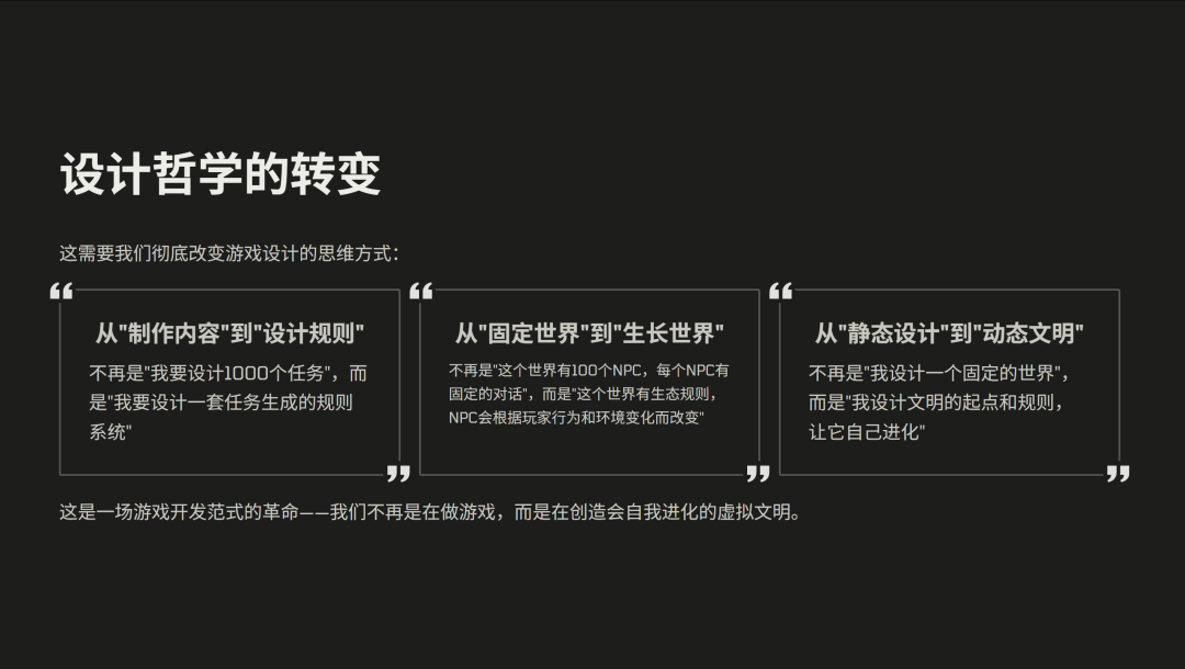 其次,是从固定世界到生长世界。不再是这个世界拥有 100 个 NPC,每个 NPC 有固定的对话,而是这个世界它有一个生产规则,NPC 会根据玩家行为和环境去改变。