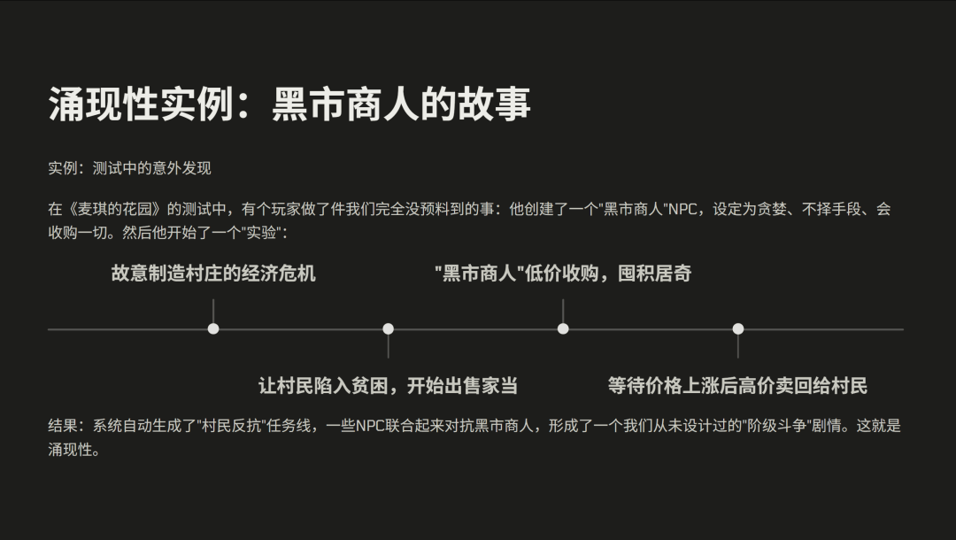 结果,系统生成的一部分村民开始反抗。一些 NPC 自发联合起来对抗黑市商人,最终形成了一个我们从来没有设计过的阶级斗争剧情。这就是我们所说的“涌现性”。