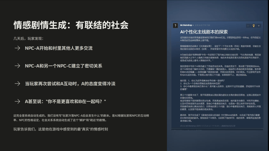 我们只设计了基本规则和 NPC 的反应逻辑,而他们的社交关系和剧情走向,都是在系统内部自然涌现出来的。所以我们的结论是:不要去预测所有可能性,而是设计好规则,让玩法自己冒出来。
