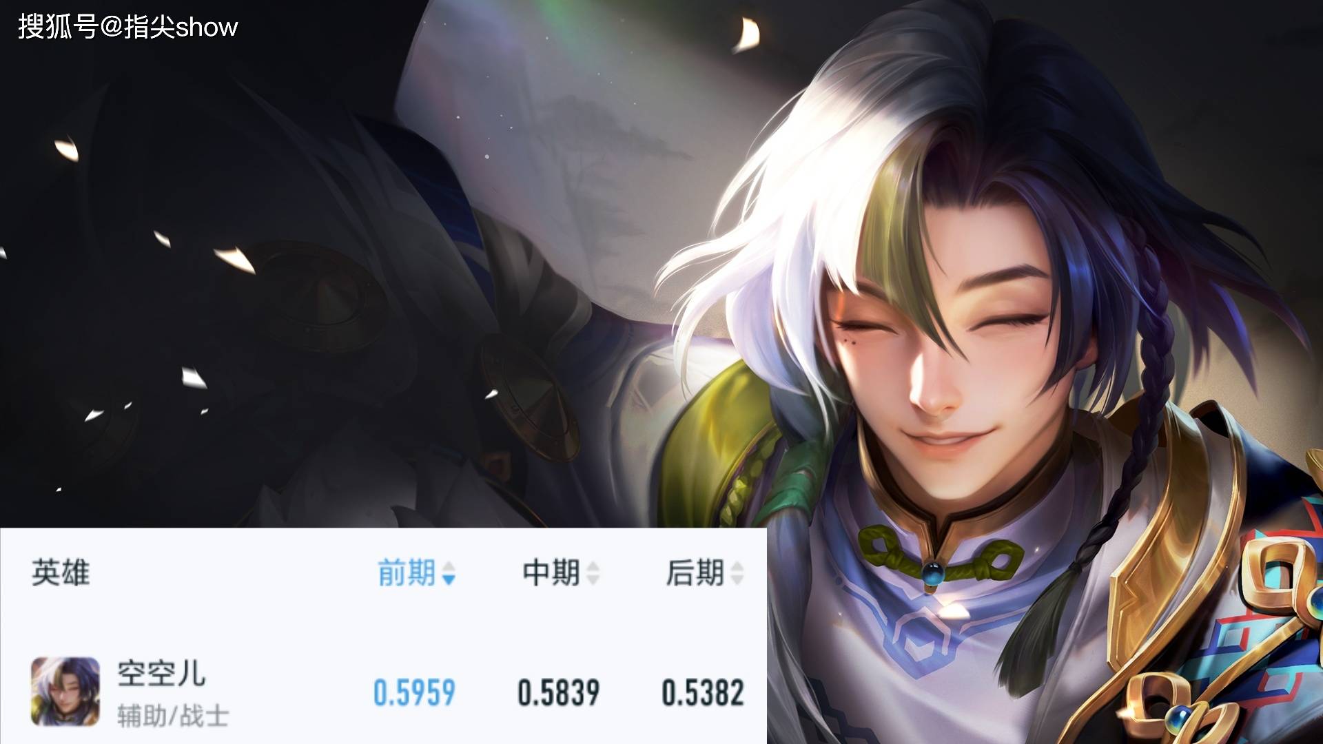 空空儿,在游走英雄的数据中就是全期强势的存在,前期59.59%,中期58.39%,后期53.82%,均列于游走位榜首,或许和英雄自身的真实水平有差距,但能见到如此盛况,以前还真没出现过。
