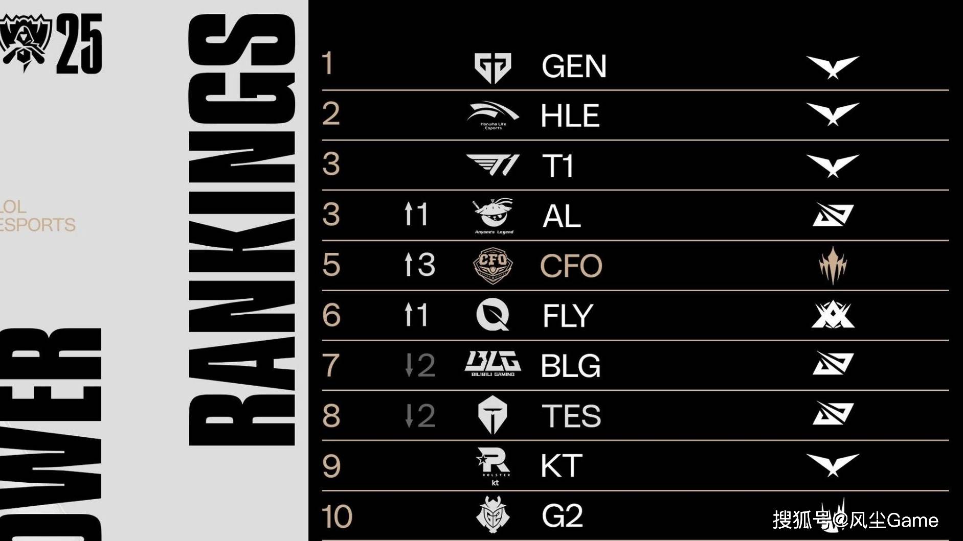 英雄联盟S15全球总决赛,瑞士轮前三轮结束之后,LOL官方重新评估了,各大参赛战队的实力,新的战力榜单,前三依旧LCK被包揽,不过AL和T1是并列第三的,原本排在第4-5名的滔搏和BLG,被降至第7-8名,CFO连跳三级挤进前5,FLY上涨到第6名,剩下的队伍,没有太大的变动。