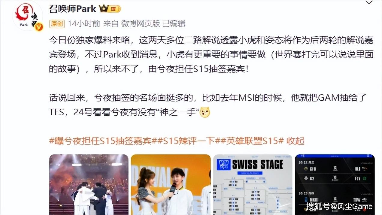 世界赛第四轮和第五轮的抽签嘉宾,已经曝光了,原定是小虎和姿态,但小虎因为有更重要的事情,所以没法参加,兮夜会代替他去抽签,据Doinb爆料,WBG上中野三兄弟,都去官方陪练团了,小虎估计是也因为这个,才抽不开身吧,少了虎大将军的参与,说实话还真少了点乐子啊。