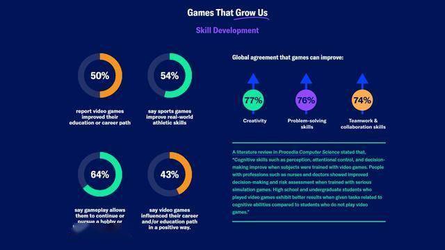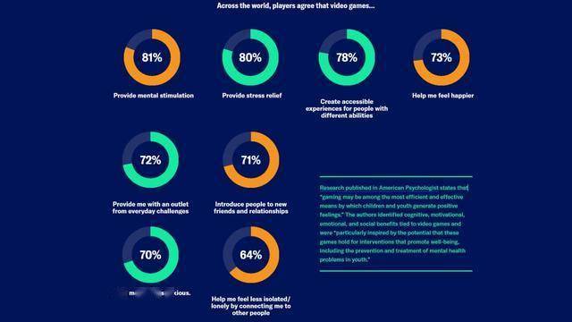 调查还发现,81%的玩家认为游戏有助于保持思维敏锐;80%的人将游戏视为缓解压力的手段;64%的人认为游戏帮助他们减轻孤独感并建立社交联系。ESA指出,游戏已逐渐成为成年人日常生活中兼具娱乐、社交与心理放松功能的重要部分。