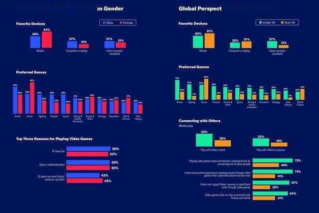 报告基于对来自21个国家、超过2.4万名玩家的调查结果指出,越来越多的中年及年长群体将游戏视为放松、娱乐和思维刺激的方式。性别比例方面,玩家群体几乎均衡,女性占48%,男性占51%。在设备使用上,55%的受访者主要通过智能手机进行游戏,其次是PC与主机,分别占比21%。