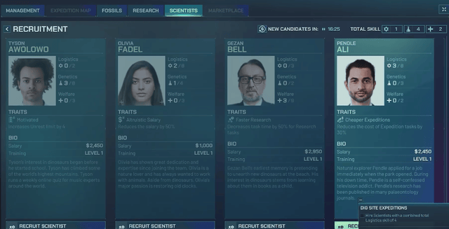 科学家们还负责研究新的挖掘点、围栏、游客设施、公园管理建筑等等,每位科学家都有三项技能和特质,比如加快探险速度、降低孵化成本等,薪资也会随能力高低而变化。能者多劳自然也需要更高的成本了,在有限的预算和五个科学家的槽位里,如何搭配出合理的技能配置还是很有考究的,让可玩性和代入感大大提升。