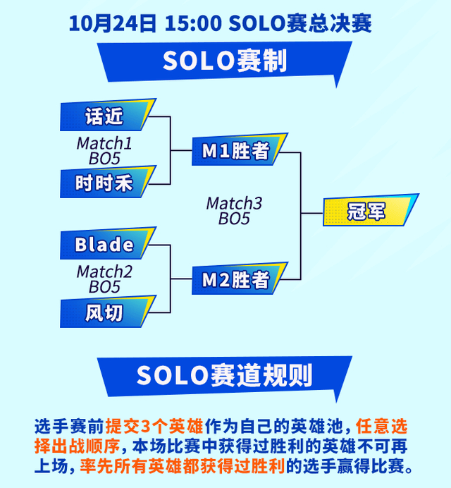 赛制:采用Bo5选3车轮的方式,选手赛前提交3个英雄作为自己的英雄池,任意选择出战顺序,且本场比赛中获得过胜利的英雄不可再上场,率先使用所有英雄都获得过胜利的选手赢得比赛。
