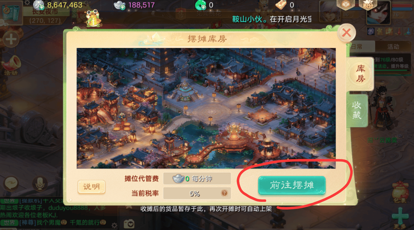 大家找不到摆摊入口的,可以通过包裹——左侧【摆摊】——点击进入——前往摆摊,摆摊需支付摊位费,小金蟾代管摊位,按分钟收取,初始无需费用,每周一5:00,代管费上涨20银两/分钟,最高上限1000银两/分钟。