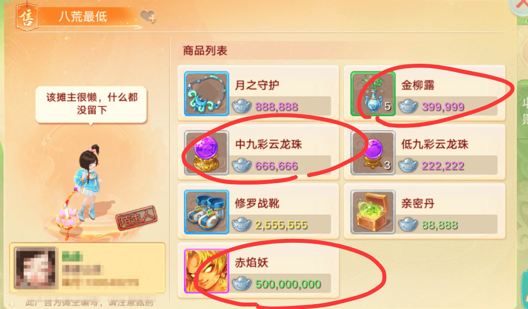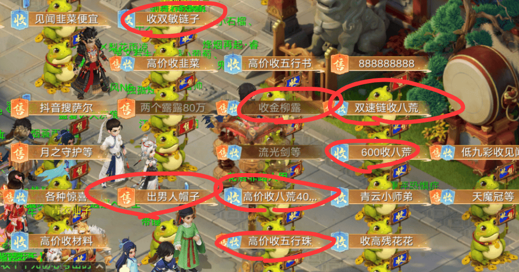 第二种是低价值快消品,比如见闻录、九彩、八荒、金柳露等,这些是合成高装必备材料,或者是用于提升角色属性,炼化装备的核心道具,价格波动大但利润可观,大家可以标价9999、8888这一类而非1万,提高成交速度。