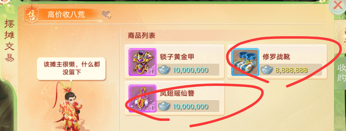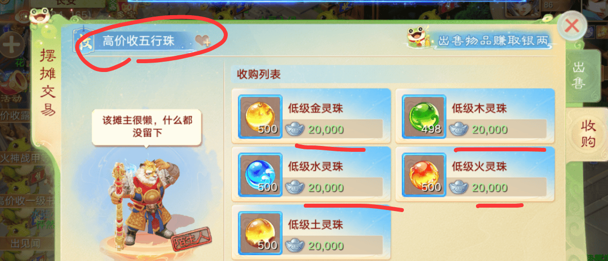 摆摊收购的话,高价收材料的也很多,五行珠、金柳露、八荒、高九彩、见闻录、高书等都有人收购,大家可以多逛逛摊位对比一下价格再出手。