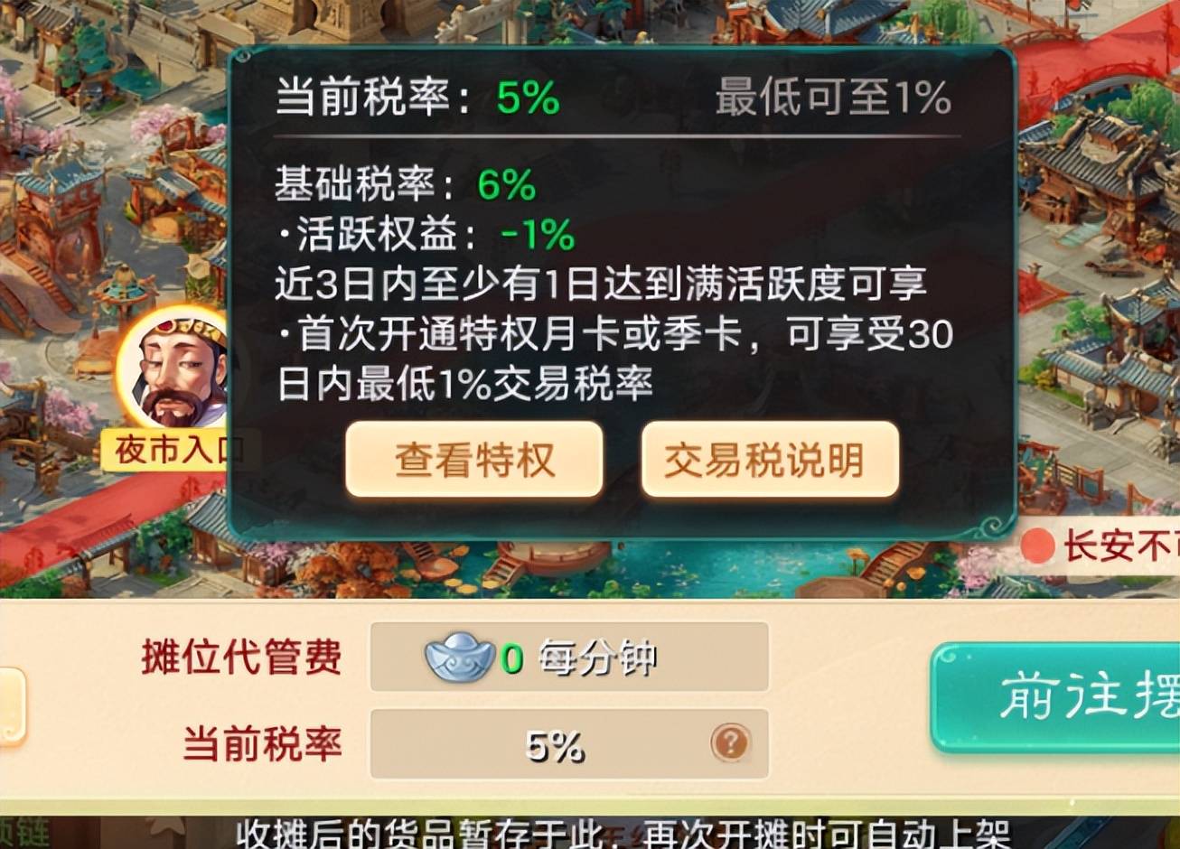 这个也是大话玩家比较关心的一个话题,二测当前基础税率6%,保持高活跃度可享受额外税费-1%,比如叶子猪今天活跃度拉满125,税费就减免了1%。再一个就是特权卡月卡或季卡,可享受30日内最低1%的交易税率。
