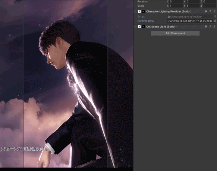 大家接下来看到的,就是在编辑器里进行动态配帧的实录。我们可以像处理角色动画一样,为光照变化「K帧」,精细调整每一刻的光影效果。可以看到,其中大量的参数都被设置了关键帧——不仅是后处理效果,包括灯光、阴影的细微调整,也全都录入了动画曲线。