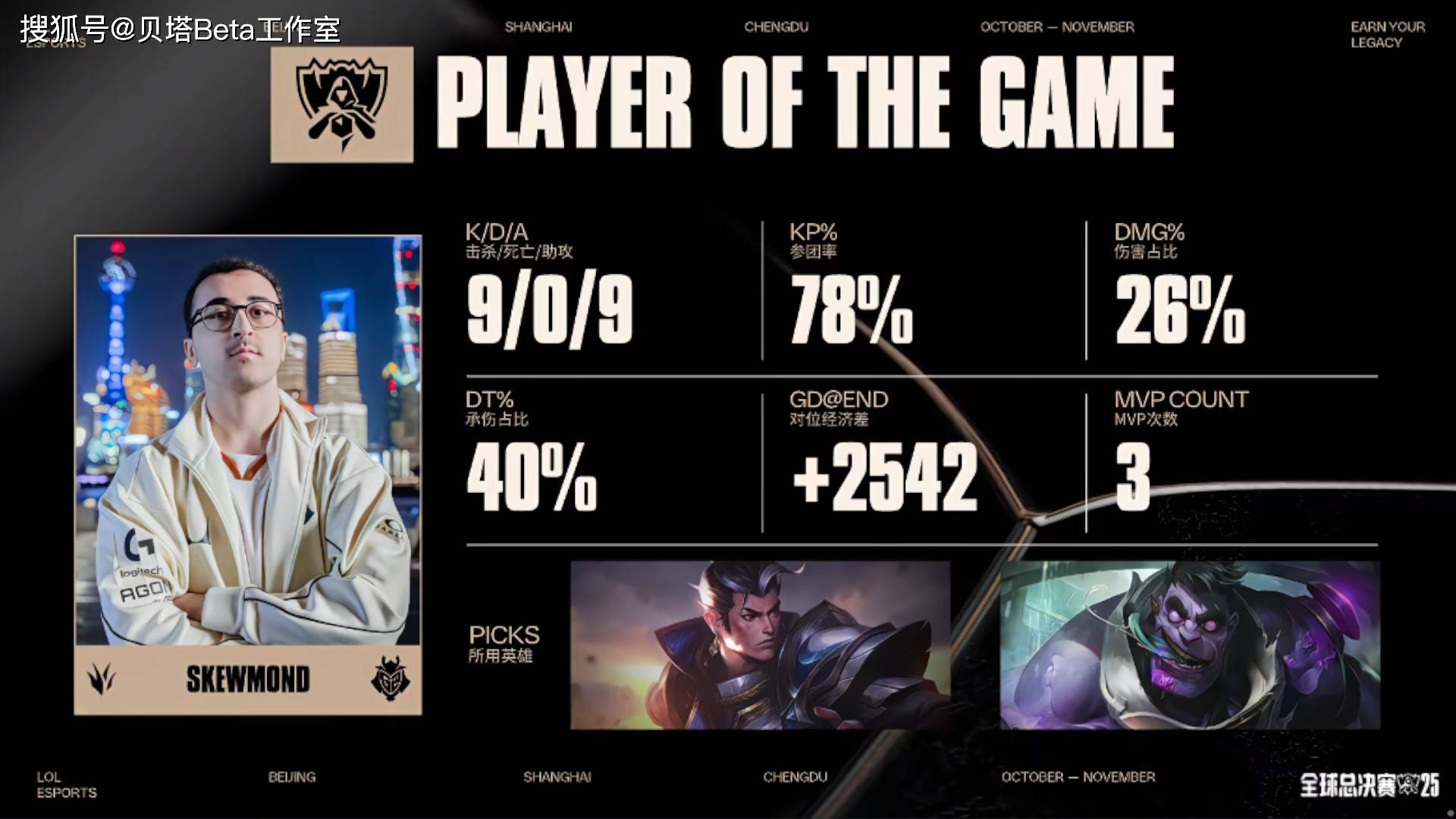 中期G2拿下厄塔汗。25分钟G2主动打大龙,TES赶来阻止,JKL希维尔失误被秒,G2打出0换3后,拿下第一条大龙。最终后期32分钟G2在高地团灭TES后,拿下第二局的胜利。MVP给到Skewmond的蒙多。