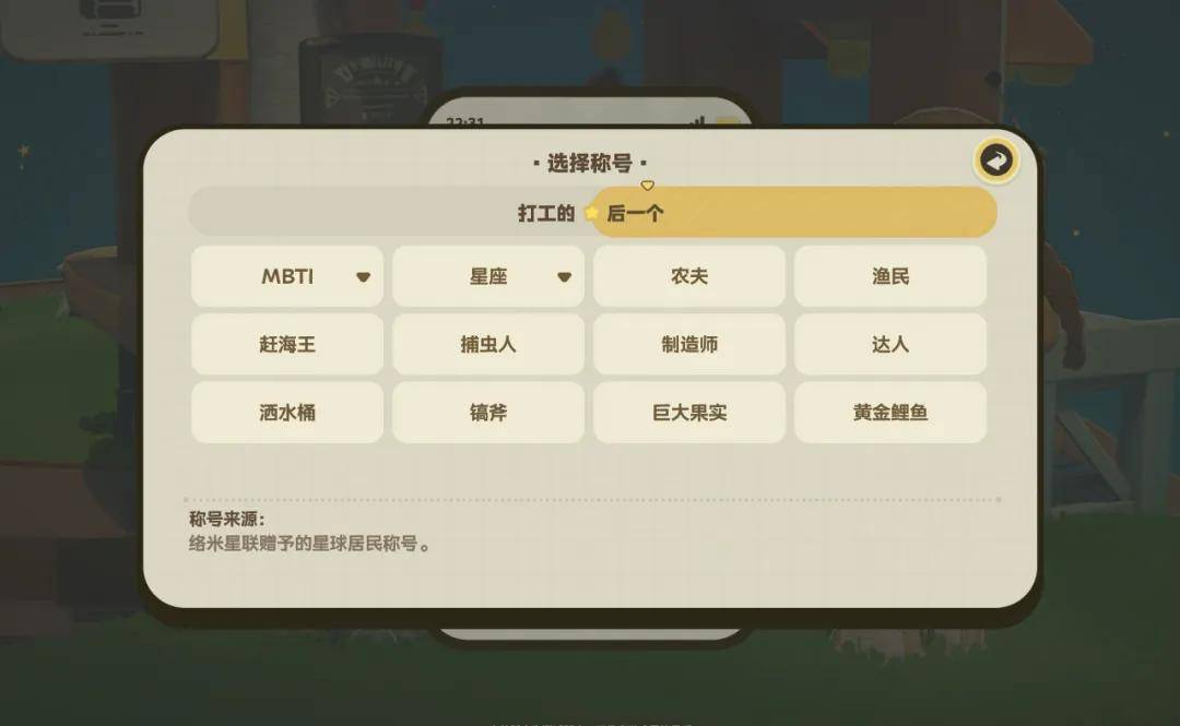 当然开始前游戏有一个简单的捏脸系统,以及称号选择。捏脸并不是一次定终身,后续游戏进程中也可调整,而称号选择要更加俏皮,不仅有“打工的”“睡不醒的”等称号,也可选择星座和MBTI,这种向外界展示自身的小设计也是游戏社交玩法的一部分,可快速拉近陌生人间的距离。