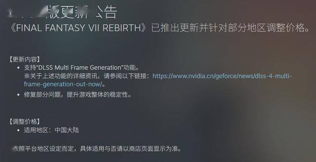 SE于11月4日发布《最终幻想7:重生/重制版》公告,表示已推出更新并针对部分地区调整价格。本次更新新增了DLSS多帧生成与其他性能优化。而本次针对部分地区调整价格的区域仅在中国大陆区域实施。
