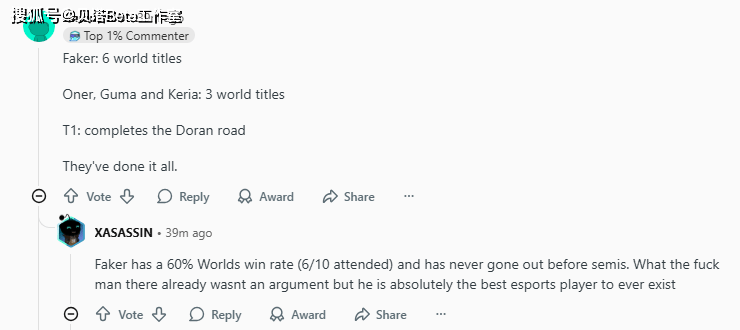 -Faker:6次世界冠军。oner、gumayusi和keria:3个世界冠军头衔。T1:完成Doran夺冠之路。他们什么都做到了。