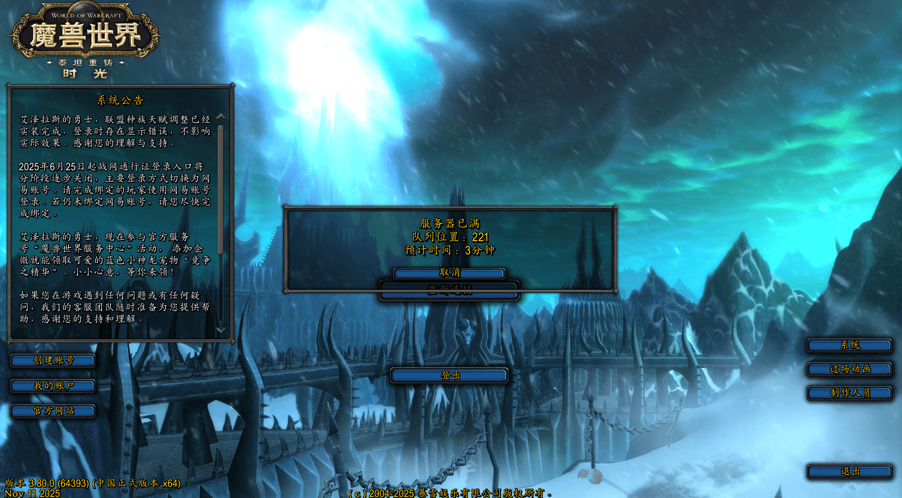 但到上午9点左右,官方拉一坨大的,所有服务器开始排队了。不仅时光服,永久60、熊猫人,甚至炉石传说等战网游戏都要排队,且这个排队是假的,之后会无限卡服务器的刷新界面,猜测可能是战网崩了,无限卡账号验证,因为已经进了游戏的不受影响。