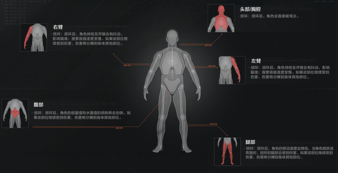 像体征设定,之前是不同的部位有不同的伤害判定,受伤后也有可能导致行动变慢等负面效果。