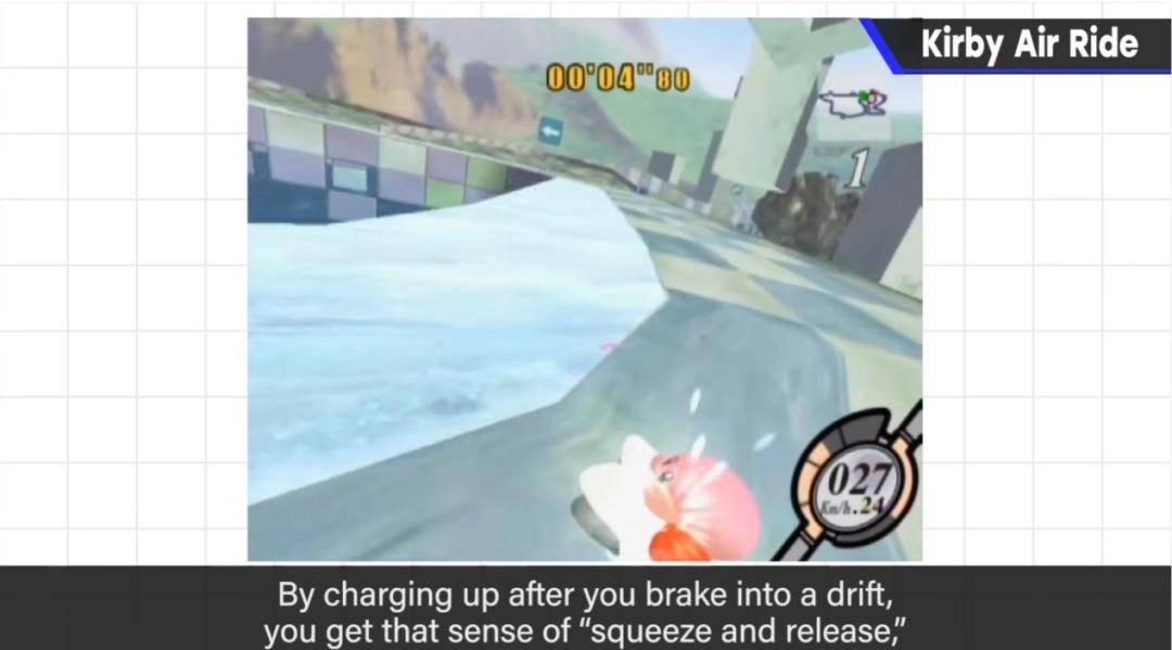 相比之下,同样的弯道,在“马力欧卡丁车”里只需要按着漂移键往弯心滑,最多左右搓两下方向微调一下方向,就能完成漂移进弯喷射出弯的全套操作……就我的体感而言,哪怕是“极限竞速”之类正经的赛道竞速游戏,过弯时要考虑的可能都没有《卡比的驭天飞行》多。