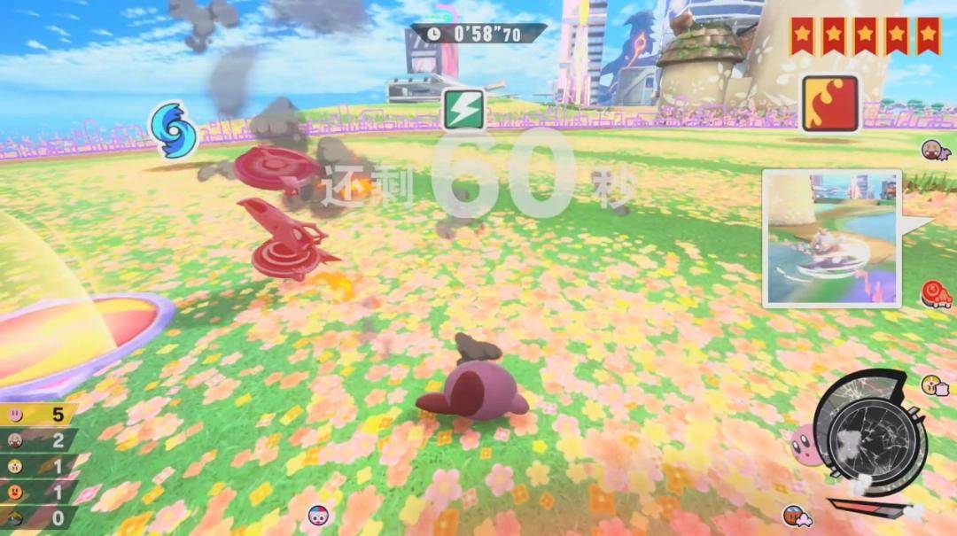 与这些被“轻视”的传统竞速模式相比,开发团队反而将更多的开发重心倾注到了被其他游戏视为旁支的“派对模式”上——这也是《卡比的驭天飞行》最为人津津乐道的模式,即“城市竞赛”。