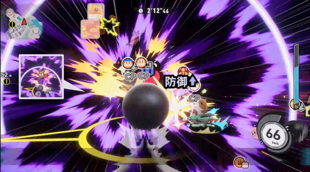 在比赛中,玩家速度表下方的必杀技计量槽,会随着时间和击败杂兵而逐渐累积,一旦充满就能在有限的时间内,使出拥有夸张视觉效果必杀技。以默认角色卡比为例,他的大招就是掏出《星之卡比重返梦幻岛》中的超级大剑,在获取加速的同时,将面前极大范围内的对手统统砍飞。