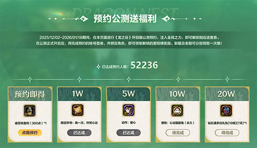 在《龙之谷》怀旧服上周公布公测定档2026年1月6日时,同步推出了公测预约活动。无论是新谷迷还是资深冒险家们,参与《龙之谷》怀旧服公测预约,即可解锁里程碑奖励。“再一次,怦燃心动”活动专属称号、动作“爱心”、永久宠物心动蹦蹦兔,等你来免费抱走!达成20万预约,冒险家们更可在公测开启后免费领取钻石潘多拉礼包(10组)!邀请好友预约公测,还有福利加码哦。
