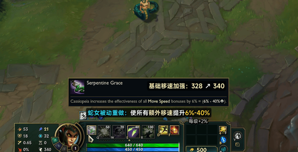 值得一提的是,蛇女是在2016年5月4日的6.9版本公告中宣布重做被动并且禁止购买鞋子,而新赛季预计在1月初上线,算起来也将近10年了。重做后的蛇女基础移速由原来328提升至340,所有额外移速效果将随等级提升(6%-40%),目前测试下来后期能达到恐怖的900移速。