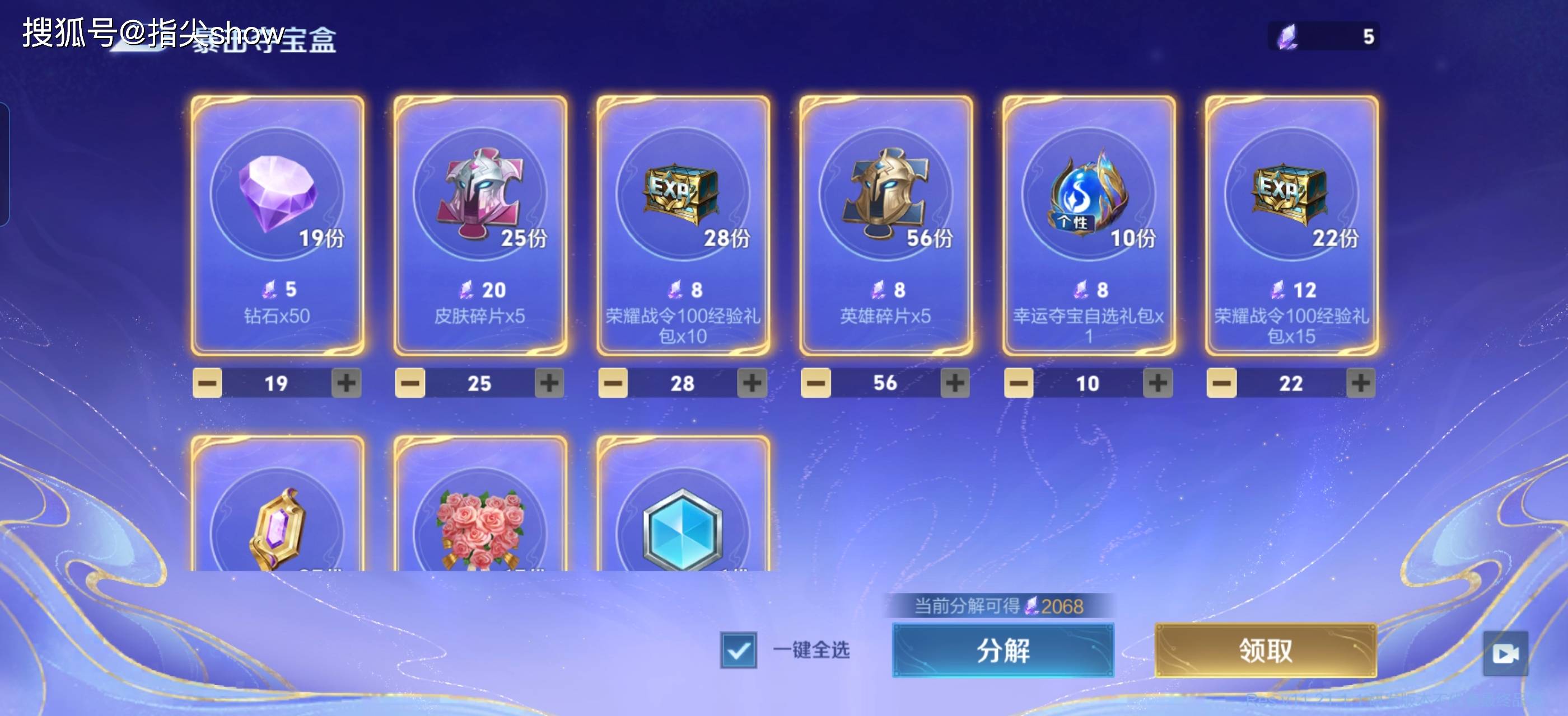 分解的内容可以参考上图,除了英雄、皮肤和荣耀水晶,你抽到的一切道具都可以分解,最值钱的就是皮肤碎片*5了,可以分解20个夺宝碎片,只是不知道换一个个性资源需要多少。