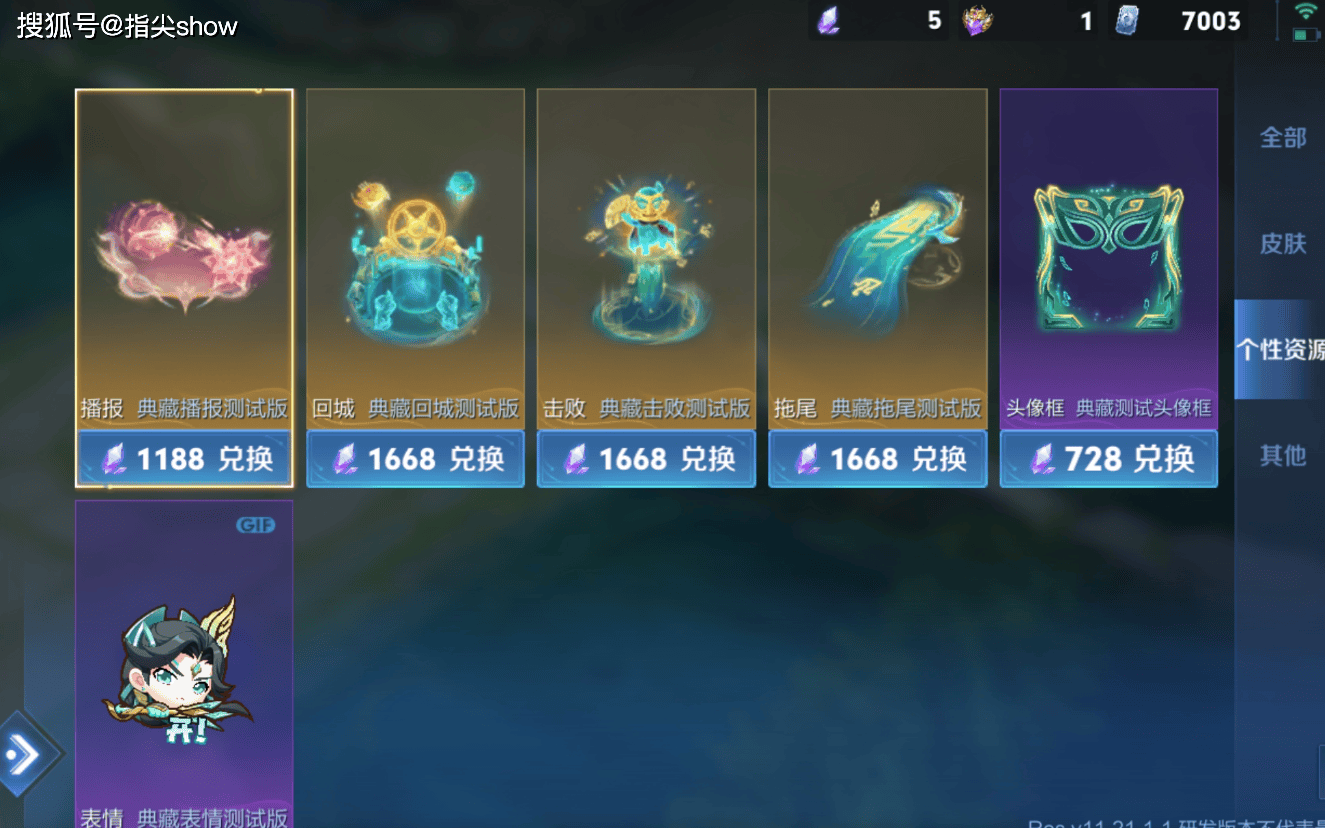 个性资源,暂时用的都是替代品,勇者皮肤是1888,史诗皮肤2888,回城特效和拖尾需要1688。