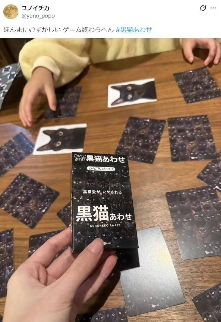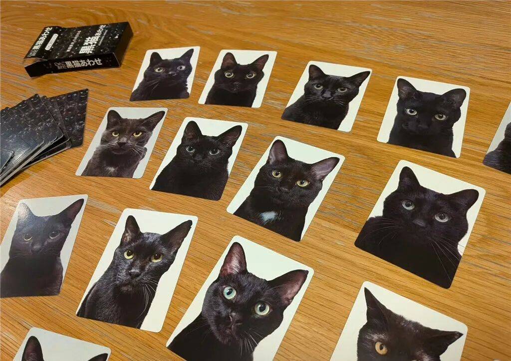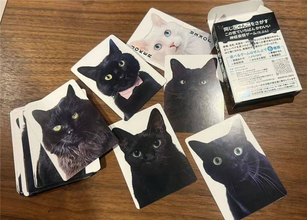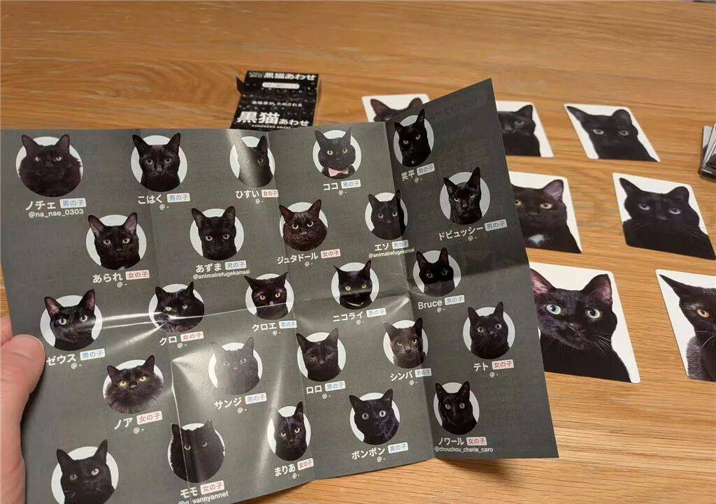 除了黑猫版本的牌之外,这种牌其实还有博美版本的。这两副牌都归属于一个系列,突出一个给你一堆长得可能很像的猫猫狗狗,让你在记住它们的长相后进行游戏,比如神经衰弱(记牌翻牌那种)、歌牌等等玩法。