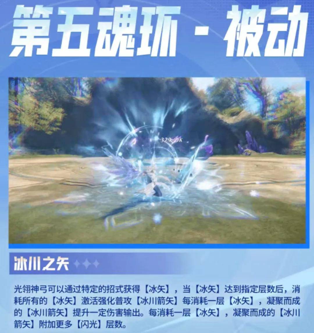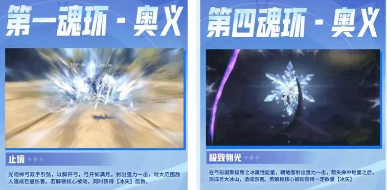 接着结合到光翎的两个大招来分析,其基本上都是纯输出型的大招,外加可以给敌人施加一个“冰矢”状态并叠加层数,当然这个“冰矢”也是提升光翎斗罗输出的一个核心状态,等下在被动技能部分我们再详说。