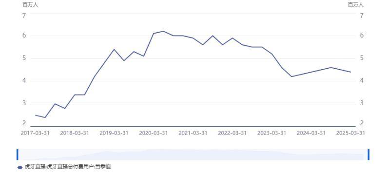 自2023年以来,直播行业整体红利消退,虎牙的核心指标持续承压。2022年至2024年,虎牙付费用户数分别为563万、458万和450万。相比之下,B站2025三季度月付费用户超过3500万。