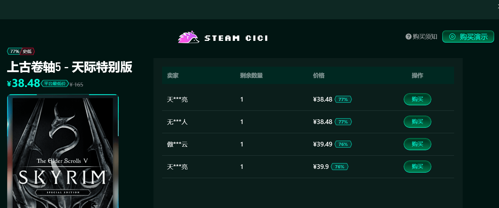 以开头说的《上古卷轴5》来说,在steamcici上甚至低到只要38就能入手正版。