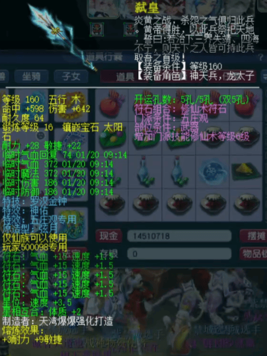 160级耐敏双加62的神佑罗汉枪(原造型法杖),16锻太阳石伤害642。这把武器具备保命特效,能在决胜时刻起到关键作用;罗汉大特技更是让全体单位增加三回合BUFF,堪称法系克星。