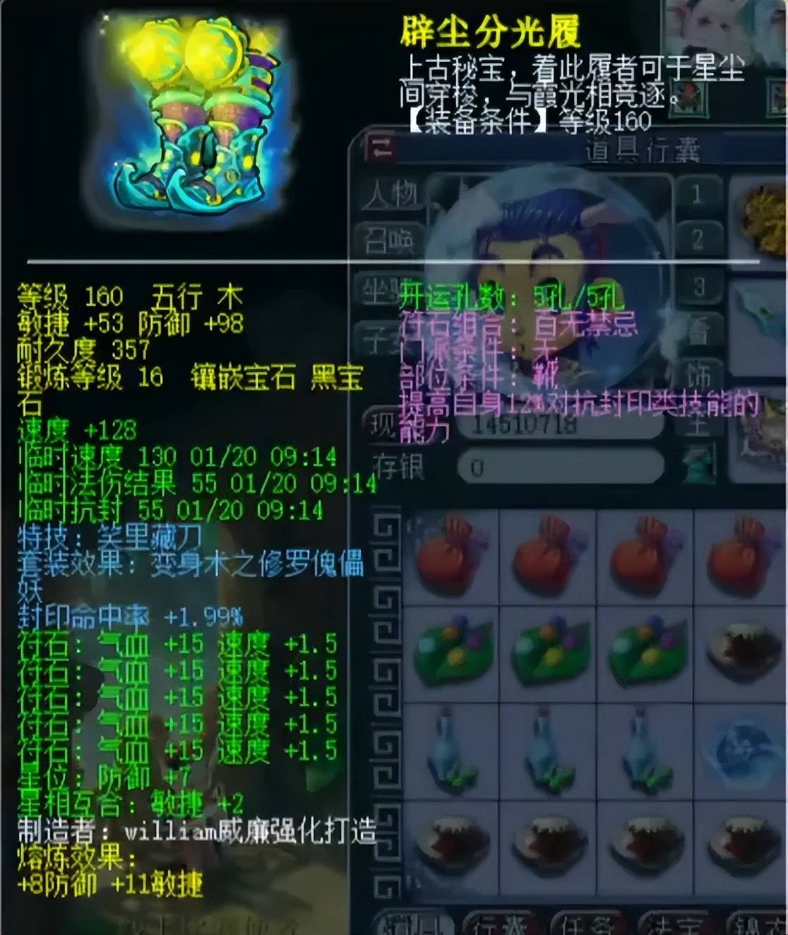 160级笑里带1.99%封印的鞋子,熔炼后敏捷64、防御106。五庄有时候作为单封体系,为了夺得优势需要争一速,高封印蓝字配合笑里特技可以把对手的愤怒值控制得“死死的”。就属性来说,这就是全服第一封印笑里鞋。
