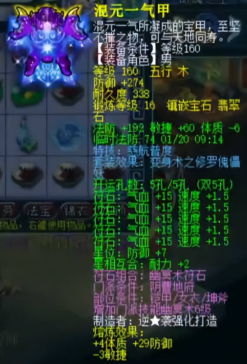 160级慈航男衣,熔炼后防御303、加57敏。属性极其优秀,慈航可复活全体倒地队友,配合龟速宠喝酒战术,打对手一个措手不及。