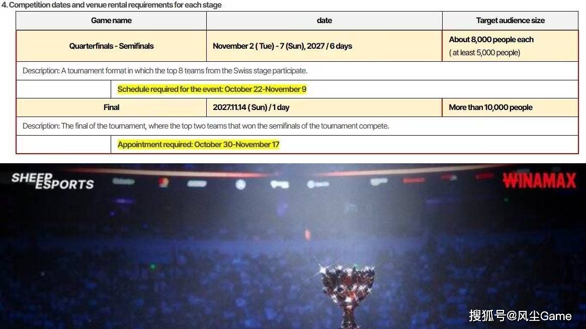 英雄联盟S16赛季,第一赛段才刚结束,LCK近日,就开始筹备S17世界赛了,韩媒爆料:KesPa官方,正式启动2027世界赛,淘汰赛主办城市招标会,官方要求,参与竞标的城市,淘汰赛场馆可容纳人数,不得低于5000,总决赛不低于10000人,并且决赛周边场地,得能容纳5000观众。