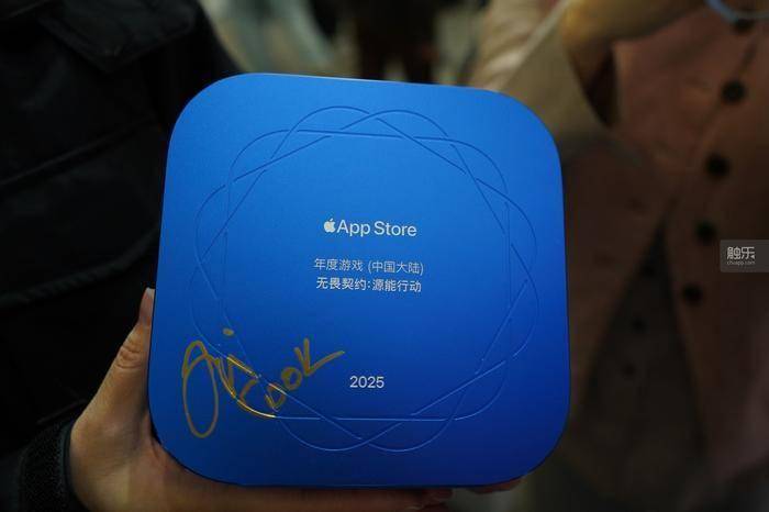 在他们面前,摆放着一个蓝色的正方形奖杯,外形就和App的图标一样,奖杯一面印着App Store的LOGO,另一面印着“2025年度游戏(中国大陆)无畏契约:源能行动”。这是《无畏契约手游》在去年12月获得的App Store Awards(中国大陆)年度游戏,这个奖一年只有一个,分量不轻。库克也对《无畏契约手游》的获奖表示祝贺,他说:“这是一个很大的成就”,随后在奖杯上用金色的油漆笔签下了自己的名字。