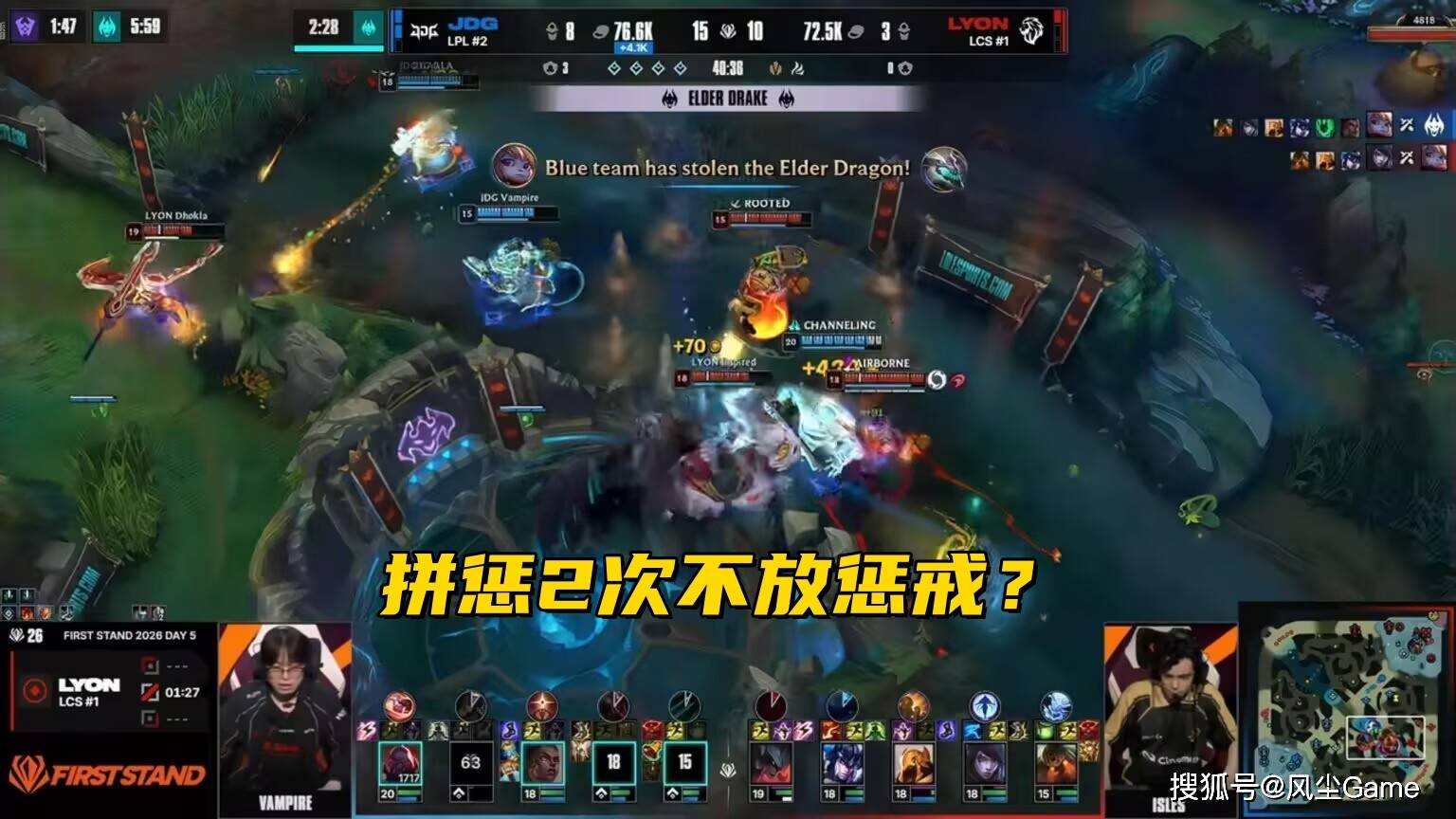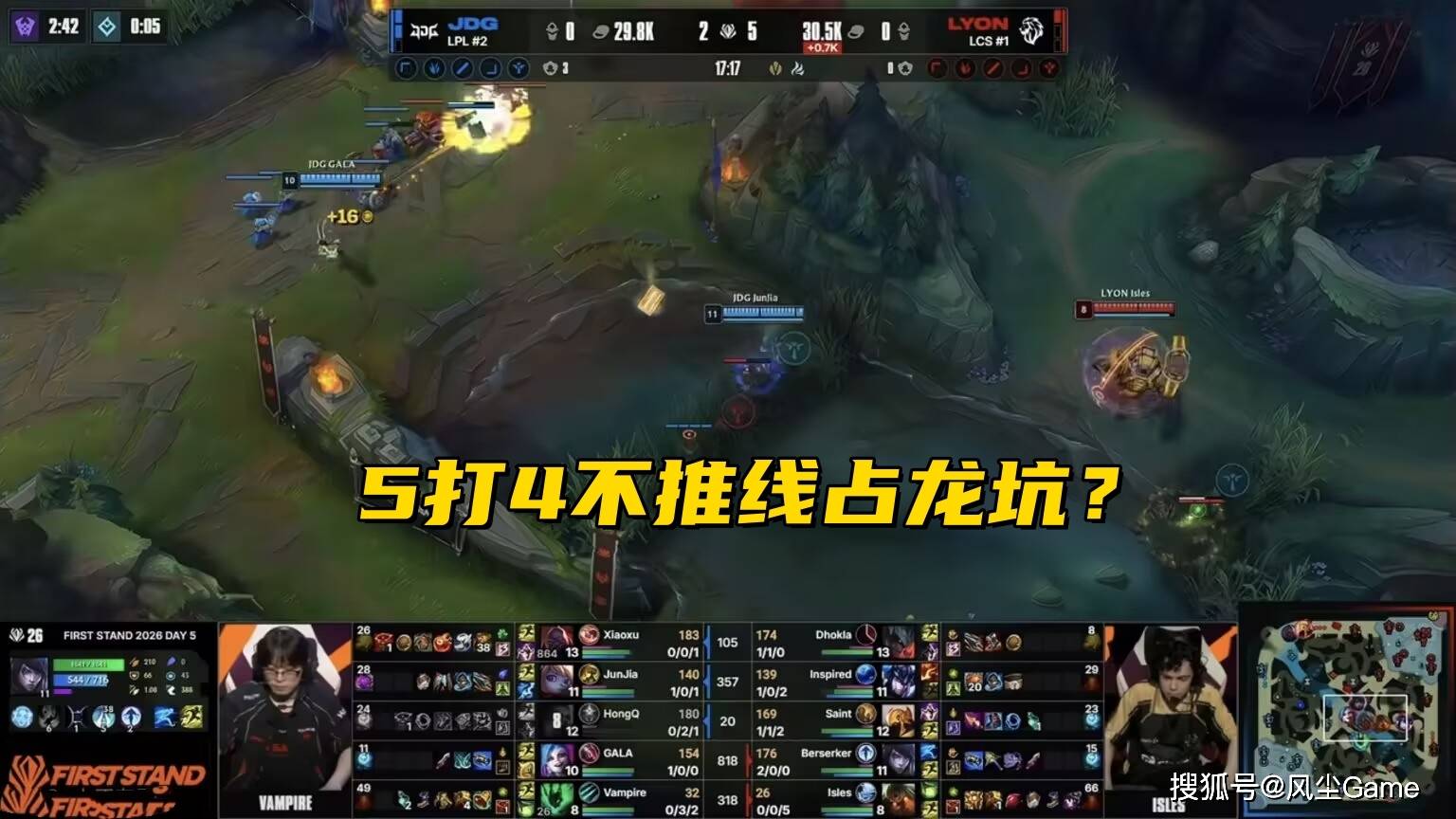 第四条小龙也很抽象,视野被京东占了之后,LYON自我拉扯,碰了一下大龙,又想回来打小龙团,结果龙已经被嘎子单吃掉了,第五条龙,又是放小龙打大龙,打到7000多血的时候,LYON突然停手了,连放三条小龙,反而让京东先拿到了停牌龙,LYON的这几波决策,是真的很抽象。