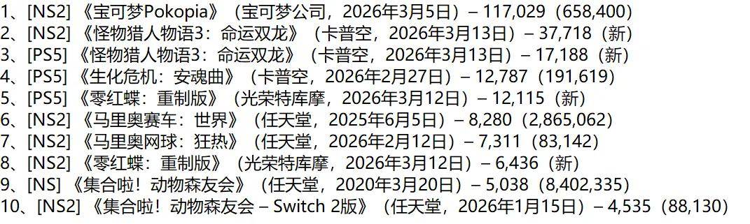 在3月9日至3月15日的新一周Fami通销量榜上,《宝可梦Pokopia》以11万7的销量蝉联冠军。