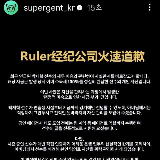 结果反转来得比想象中还快,就在大家以为尺帝要凉的时候,Ruler的经纪公司Supergent火速发布了澄清声明。声明里写得明明白白:相关资金在产生当时,就已经由选手本人诚实缴纳了100%的个人所得税,属于选手的个人资产。这次事件根本不是什么恶意逃税,而是在资产管理过程中,因为“行政处理不成熟”导致的税款征收问题。