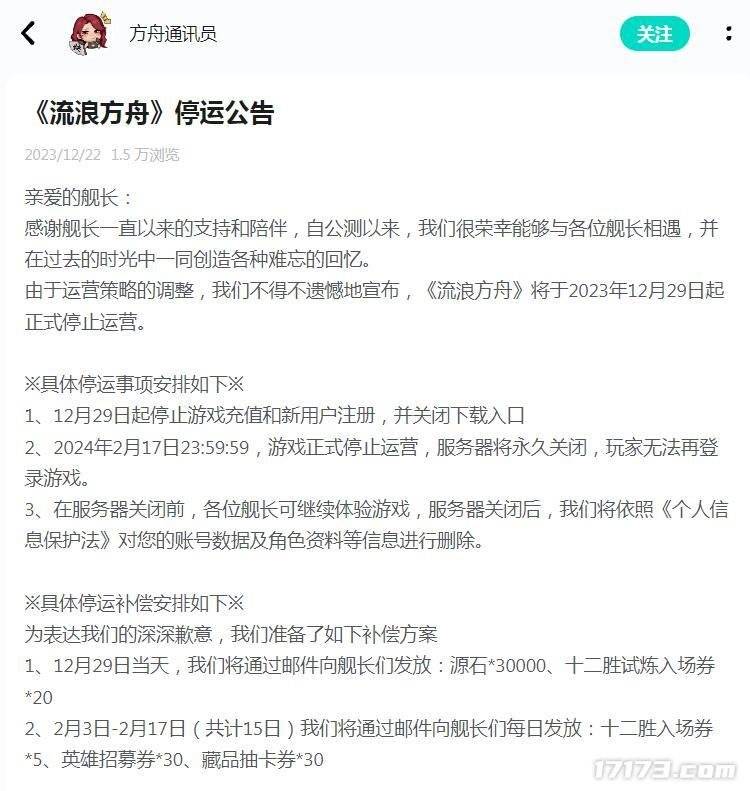 近日由玖趣互娱运营,燃猫工作室打造的策略卡牌游戏《流浪方舟》宣布,游戏将于2026年4月20日关闭下载和新用户注册,6月20日正式停运。