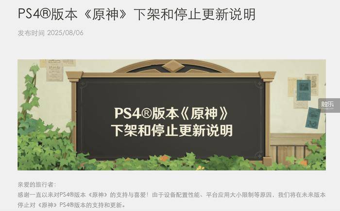 此前,米哈游提及此次停服原因系设备配置性能、平台应用大小的限制。《原神》自2020年上线后正式停止PS4版更新,这也标志米哈游全面转向新世代硬件。