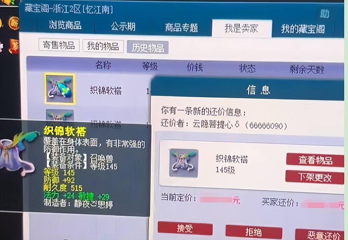 日前,一位玩家分享自己在藏宝阁售卖物品的经历。他所售卖的是下图这个敏法53的宝宝装备,一开始算是高价上架。