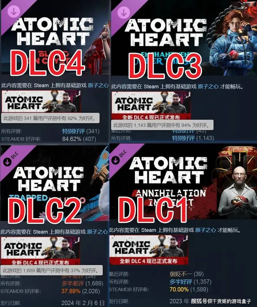 带大家看一个纸面数据,刚推出的DLC4,当前评价为347条评价,好评率为92%特别好评;DLC3,当前评价1143条评价,好评率为94%特别好评;DLC1为73%多半好评,DLC2为37%特别差评。