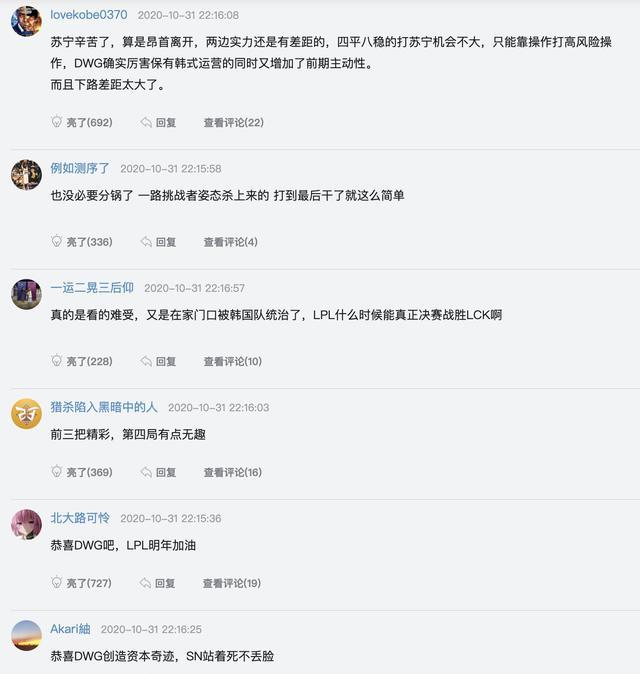 网友们在赛后也在谈论这场比赛,一些网友说,“真的很难看到,但在国内也受到韩国队的统治,当LPL真的能赢得最后的LCK啊,啊~很好的遗憾,不舒服,祝贺DWG资本奇迹,SN站死是不丢脸的。 “