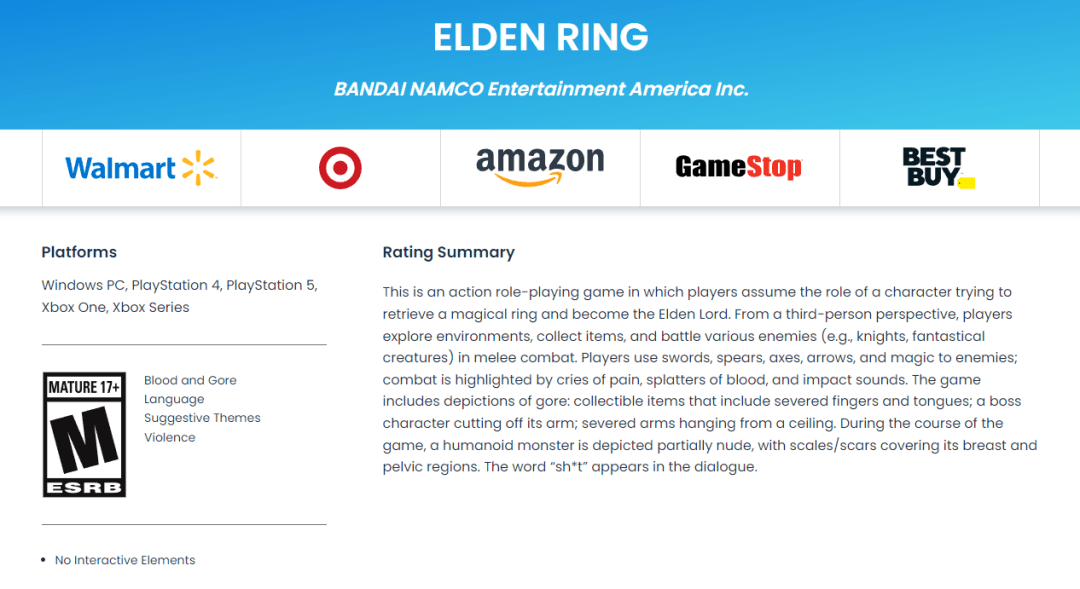 《艾尔登法环》的信息近日出现在ESRB评级网站中,并获得“M/17+”评级。