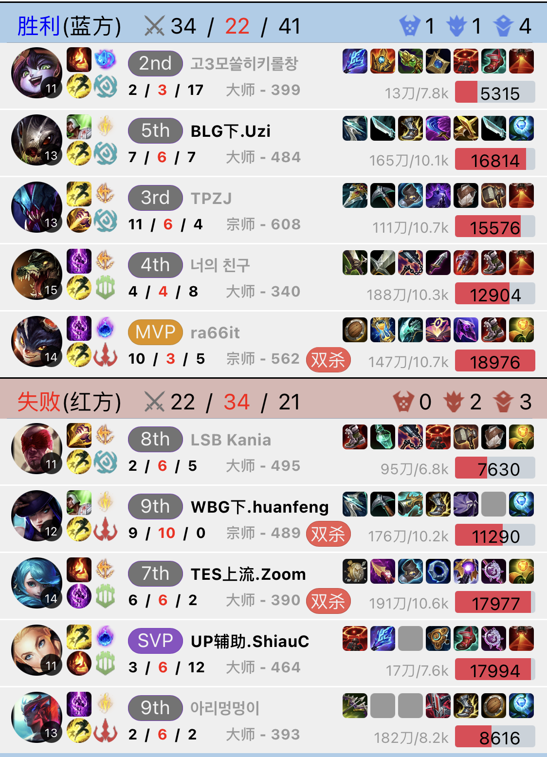 最终Uzi的女警在这场单人拿下了17杀,而Gala的大嘴则是7-12的战绩,Uzi在这次的对决中是大获全胜了,不过排位胜败乃兵家常事,在这场对局之后,Uzi是在随后的一场排位中遭到了Lwx的制裁。