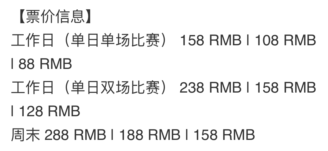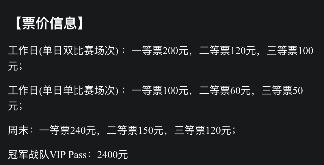 官方公布的票价是这样的:工作日(单日单场比赛)价格有3档,分别是158rmb、108rmb和88rmb,工作日(单日双场比赛)价格也有3档,分别是238rmb、158rmb和128rmb。简单来说就是座位位置价格不同,然后看观众是想要看一场BO3还是两场BO3。
