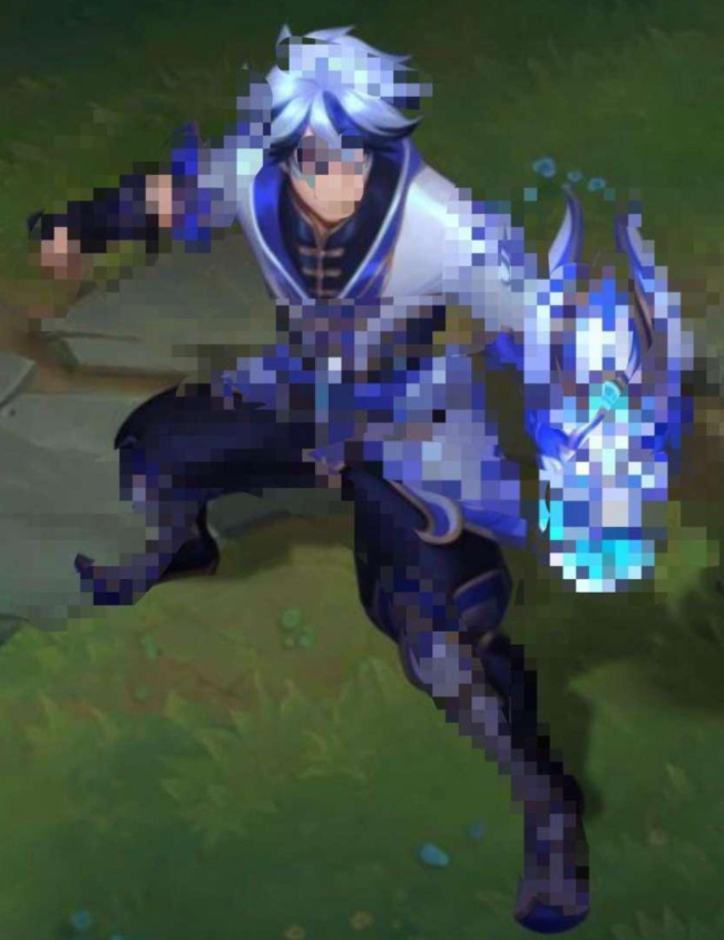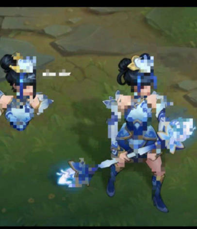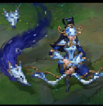 来看看这次泄露的带有马赛克的皮肤模型图,首先第一张图片能够比较清楚地辨认出是千珏,因为身边有狼灵,在这里不得不吐槽一句,这个皮肤泄露图的马赛克跟没打是一样的,英雄的特点非常明显。